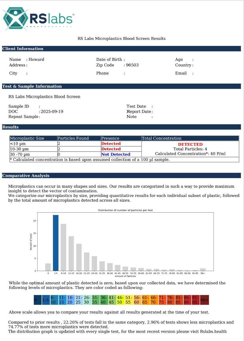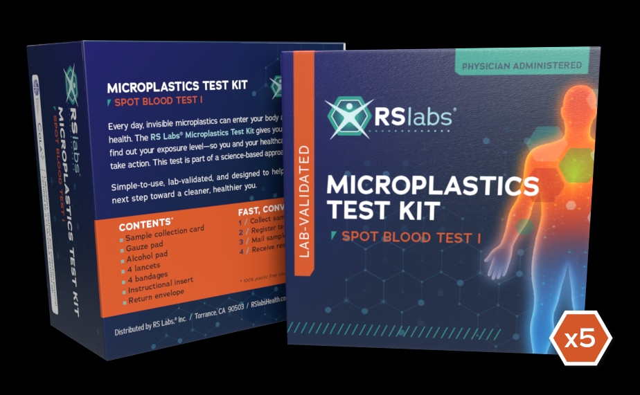 Every day, invisible microplastics enter the body and impact your patients' health. The RS Labs® Micropplastics Spot Blood Test gives you an easy way to understand your patients' exposure level so they can take action. It's simple to use, lab-validated, and designed for you to help your patients take the next step toward a cleaner, healthier life.